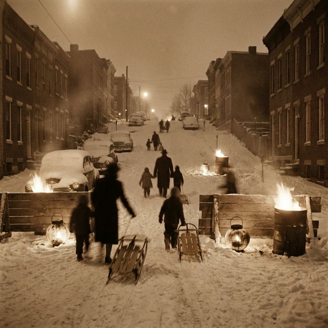 When Washington snow hit hard enough, the D.C. Police barricaded the street and the whole neighborhood came out for barrel fires, sled runs, and a block party in the dark.