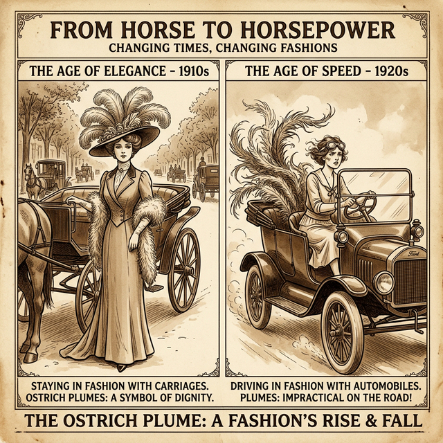 [J25]J25 — DocumentJOUR025 (Clifford J. Goodman Jr., January–July 1989)That single sentence compresses a global economic shift into a mechanical observation. The automobile killed the ostrich feather industry the same way it killed the buggy-whip industry: by making a specific physical arrangement obsolete. Feathered hats worked in enclosed carriages, where air moved slowly and a woman's ensemble could be admired at rest. In open cars traveling at thirty or forty miles per hour, the plumes whipped, broke, and tangled. Fashion, which had driven a feather to sell for more than its weight in gold, pivoted overnight. The Arizona ranchers, who had invested in breeding stock, fencing, and feed operations scaled for thousands of birds, were left with large, aggressive animals and no market.